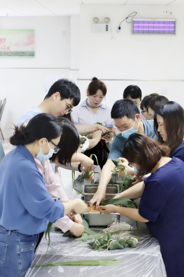 本次端午包粽子活动共有13位员工参加,大家围在一起,拿粽叶、舀糯米,忙得不亦乐乎。“卷粽叶要这么卷才能不漏米,你看这个绳子要这样扎,又好又方便。”大部分人都是第一次体验这项“手艺活儿”,在食堂阿姨的指点和演示下,每位参与者将粽叶卷成漏斗状、填装糯米、捆扎结实,很快大家也包出了漂亮的粽子。
