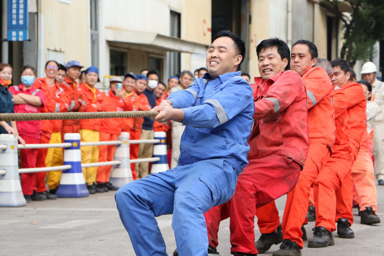 当比赛的哨声一响起,队员们高呼一二,一二,双手紧握麻绳,憋足了劲拼命往后拉;未比赛的员工们自发组成的啦啦队为比赛队员呐喊助威。无论是场上还是场下,气氛都异常紧张。