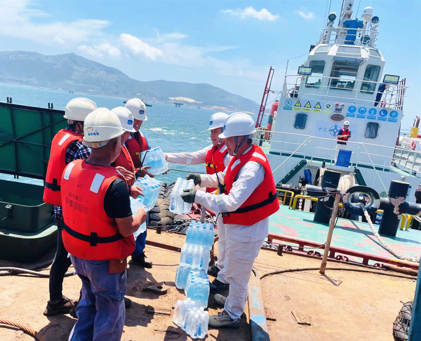 公司平潭项目部于8月22日开展“夏送清凉”活动。项目部将采购的矿泉水和盐汽水等送到拓友轮、振驳17轮、振驳22轮、振驳28轮、征途国际拖17、振半潜1、振浮10、浙嘉兴工128、浙嘉兴工198、宇航起重32等施工船舶。