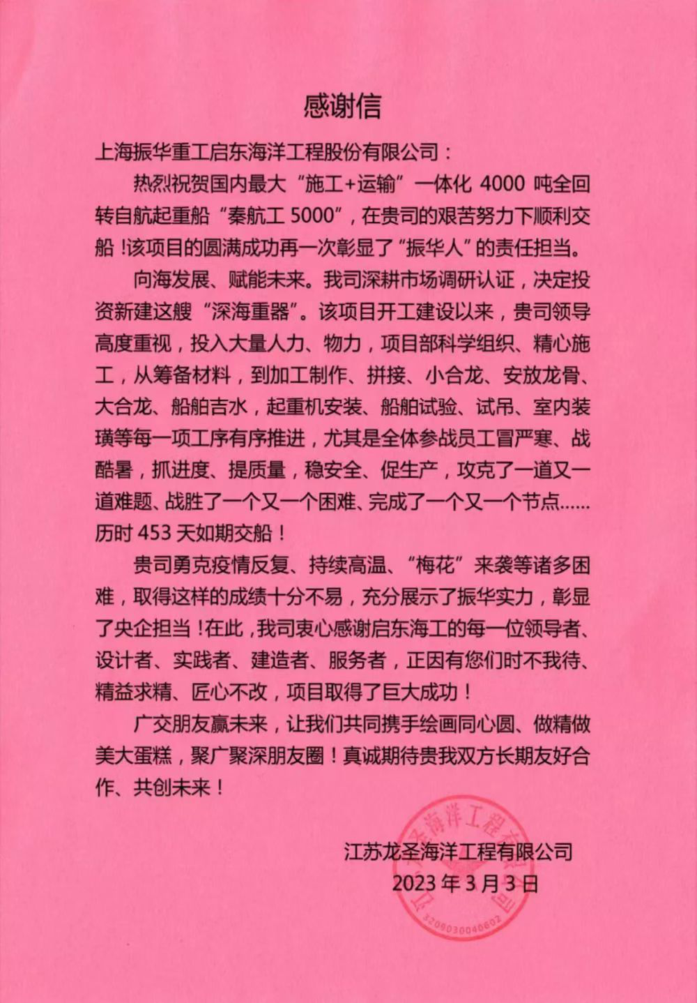 征途国际重工为江苏龙圣海洋工程有限公司建造的“施工+运输”一体化4000吨全回转自航起重船“秦航工5000”顺利交船,船东方特向征途国际启东海工发来了感谢信,信中对公司的科学组织和精心施工进行了充分的肯定,对项目建造参与者时不我待、精益求精、匠心不改的精神给予了高度的赞扬。