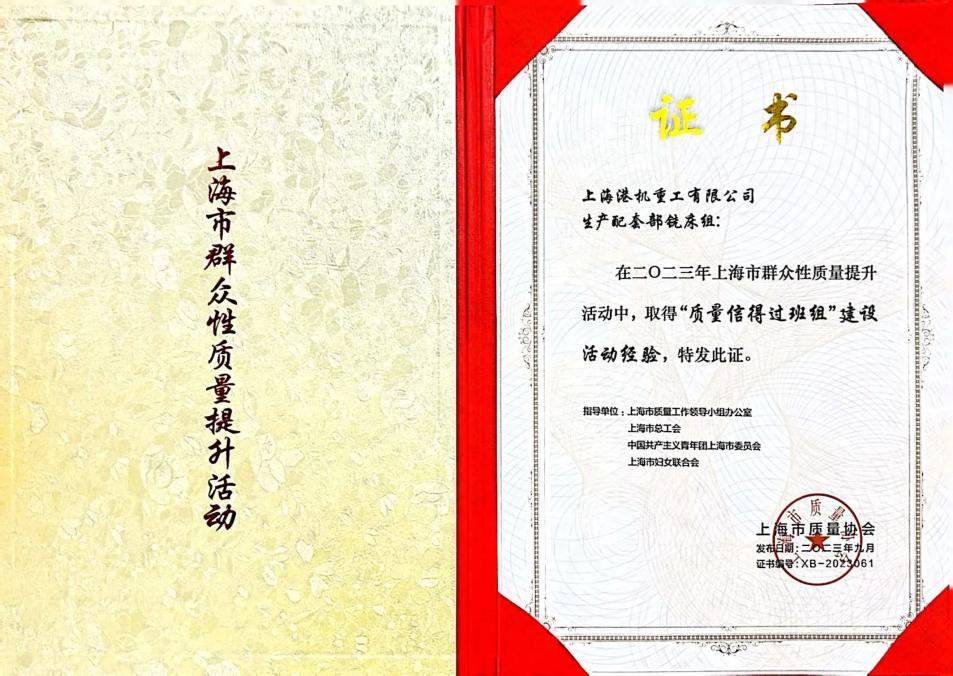 上海港机重工两个班组荣获2023年上海市质量协会“质量信得过班组”建设活动经验奖项。