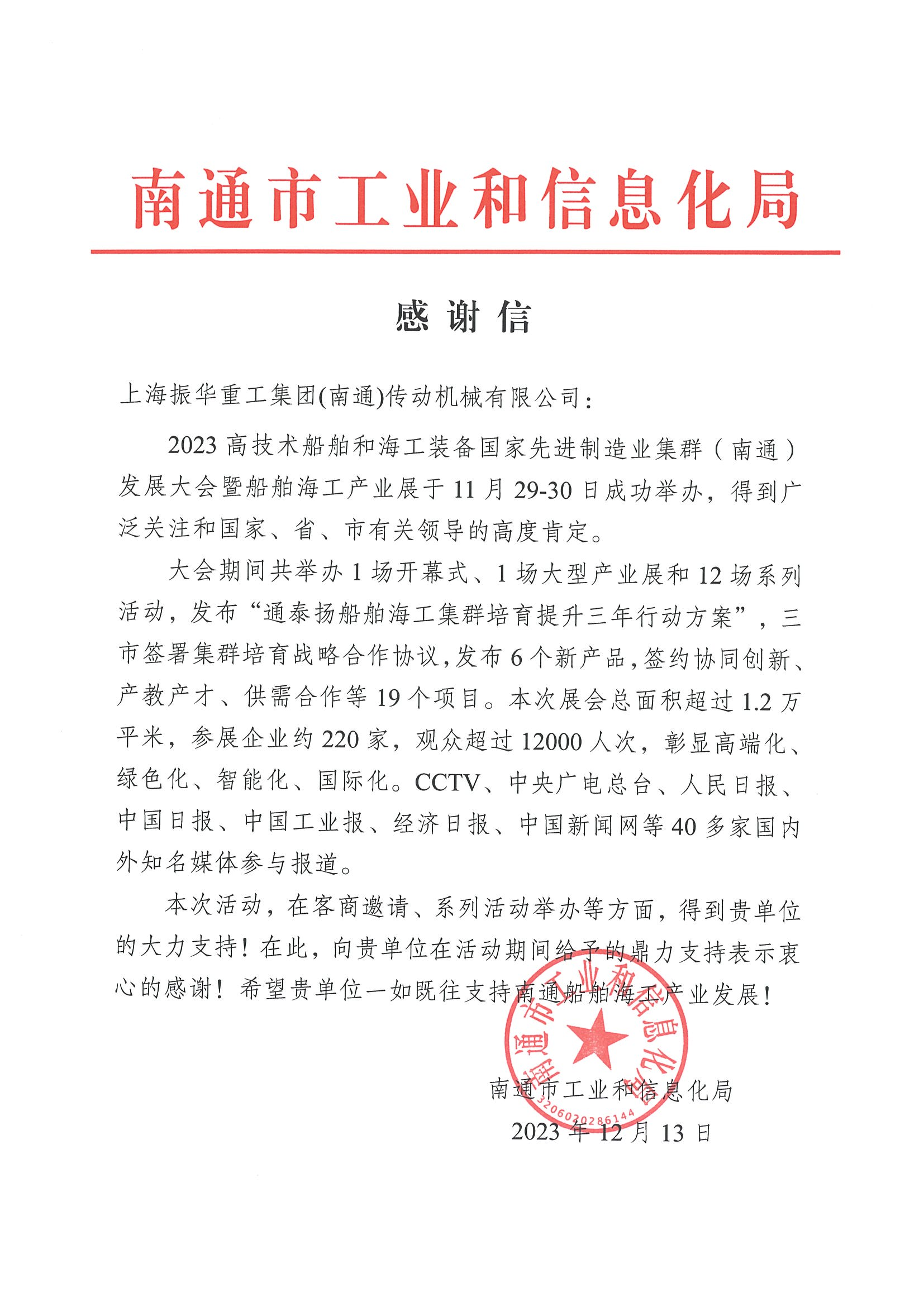 12月13日,基地收到南通市工信局感谢信,感谢基地在2023高技术船舶和海工装备国家先进制造业集群(南通)发展大会暨船舶海工产业展客商邀请、系列活动举办方面的支持。