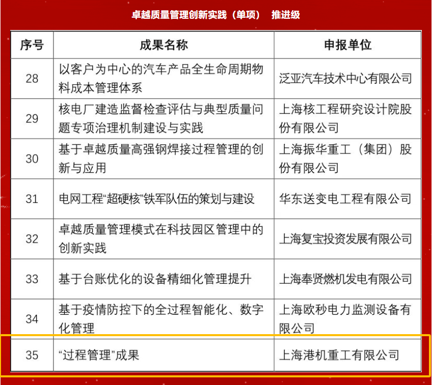 近日,公司积极参与上海市质量协会组织开展的2023年卓越质量创新成果评价活动,其中申报的“‘过程管理’成果”项目荣膺卓越质量管理创新实践(单项)推进级奖项。