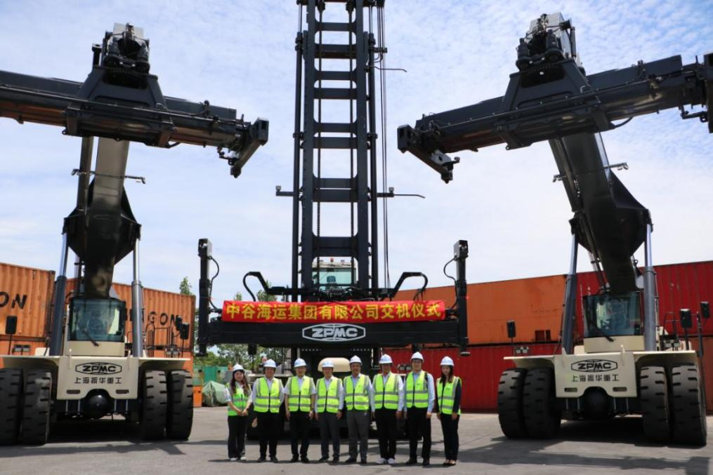 5月29日,上海港机重工举行交机仪式,向中谷海运交付两台电动正面吊和两台堆高机。