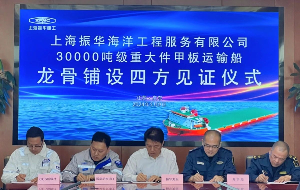 5月9日,由征途国际重工自建的3万吨级重大件甲板运输船项目在征途国际启东海工举行龙骨铺设仪式,南通海事局、中国船级社、征途国际海服和征途国际启东海工的四方代表共同签署了见证文件。