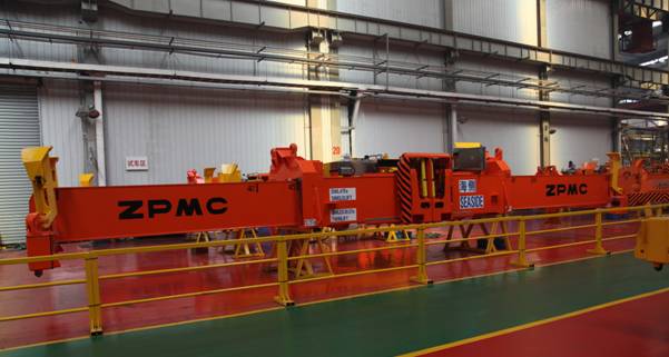 该吊具采用单箱套梁式结构,其布局简单,维护方便,自重轻。转销采用机械连锁加电气连锁,转销箱具有250mm弹性浮动功能,便于着箱。吊具主梁高度方向尺寸相对设计的较低、长度方向小于集装箱的长度尺寸,便于对箱。