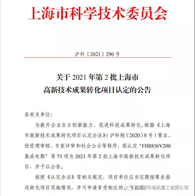 近日,上海征途国际港机重工有限公司“自动化港机行走机构平衡梁项目”成功获得上海市科学技术委员会2021年度上海市高新技术成果转化项目认定。